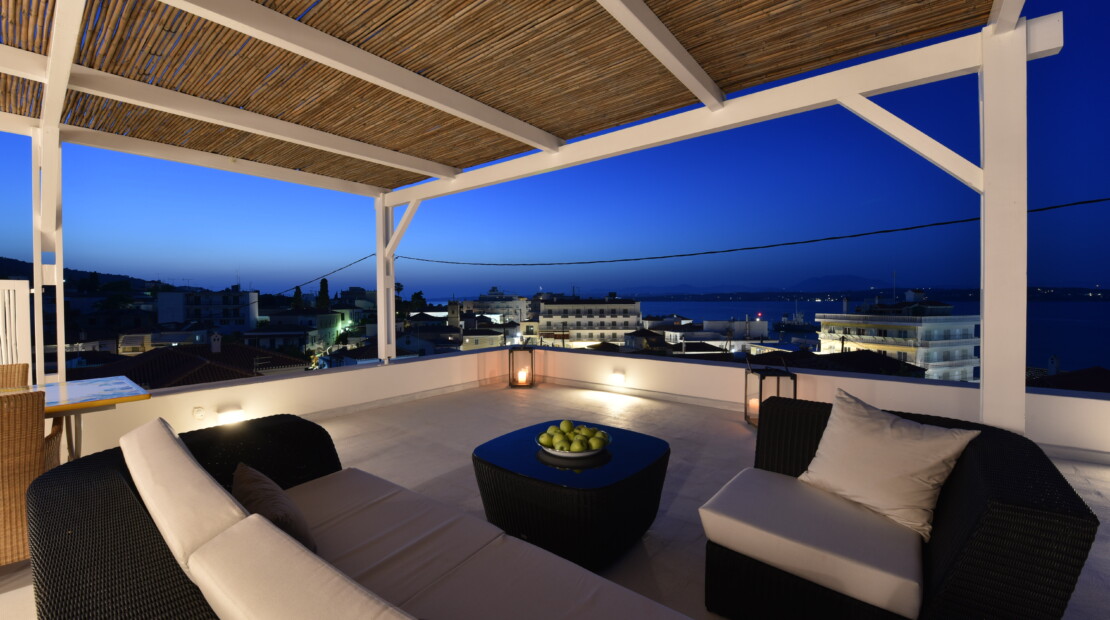 Choose one of our more exclusive stay experiences at our Executive Suite, located on the top floor of Zoe’s Club. It boasts amazing panoramic sea and skyline views of Spetses island from its rooftop terrace which you can equally enjoy both morning and evening since there is a pergola that offers ample shade. The interiors are dressed in an elegant color scheme of whites primarily with splashes of grays here and there. The Executive Suite features one bedroom with a king-size bed, a separate living room area and a bathroom with premium toiletries